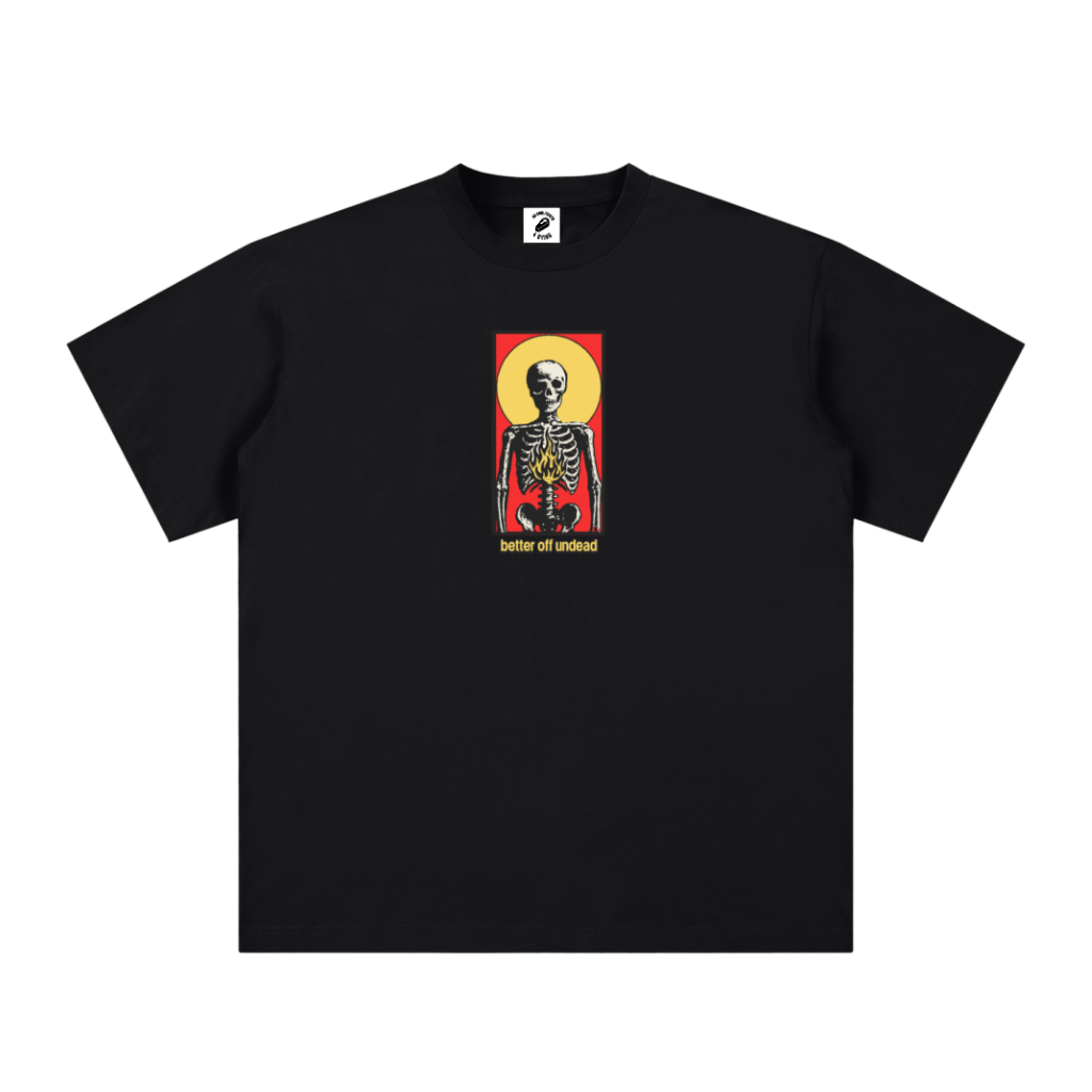 The bones are bare. The flame still burns. This design is a tribute to every soul too stubborn to quit. A skeletal figure framed by a blazing internal fire and a divine glow—reminding the world that even when life strips you down, purpose keeps you lit. Death didn’t win. It just cleared the noise.